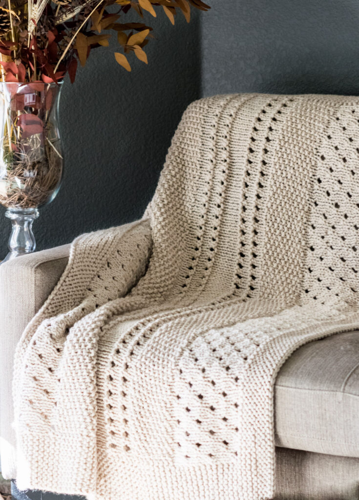 The staggered eyelets have almost a botanical look, while the other sections are varied and full of interest! This is a special fall and winter blanket that is easy enough for newer knitters, but offers enough challenge to keep you interested. Create this beautiful blanket in any color “with love”, and enjoy!