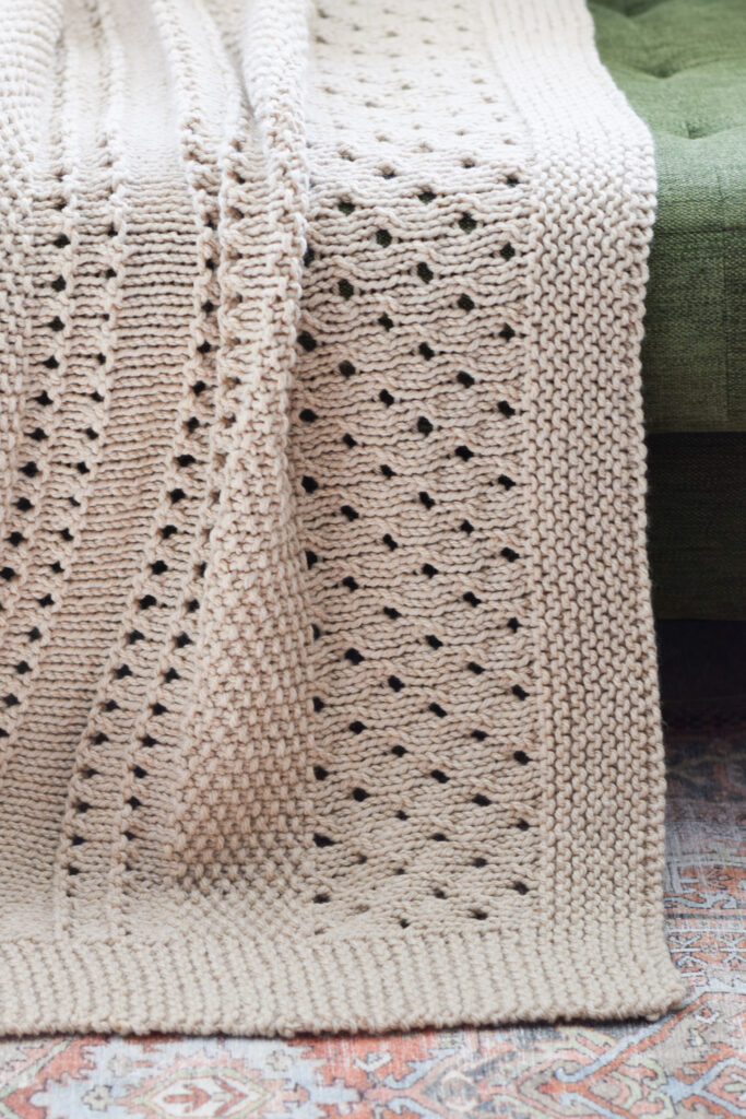 For this beautiful pattern, you’ll need chunky yarn and large needles. As long as you are comfortable with basic stitches and counting some stitches, you can make this blanket.
