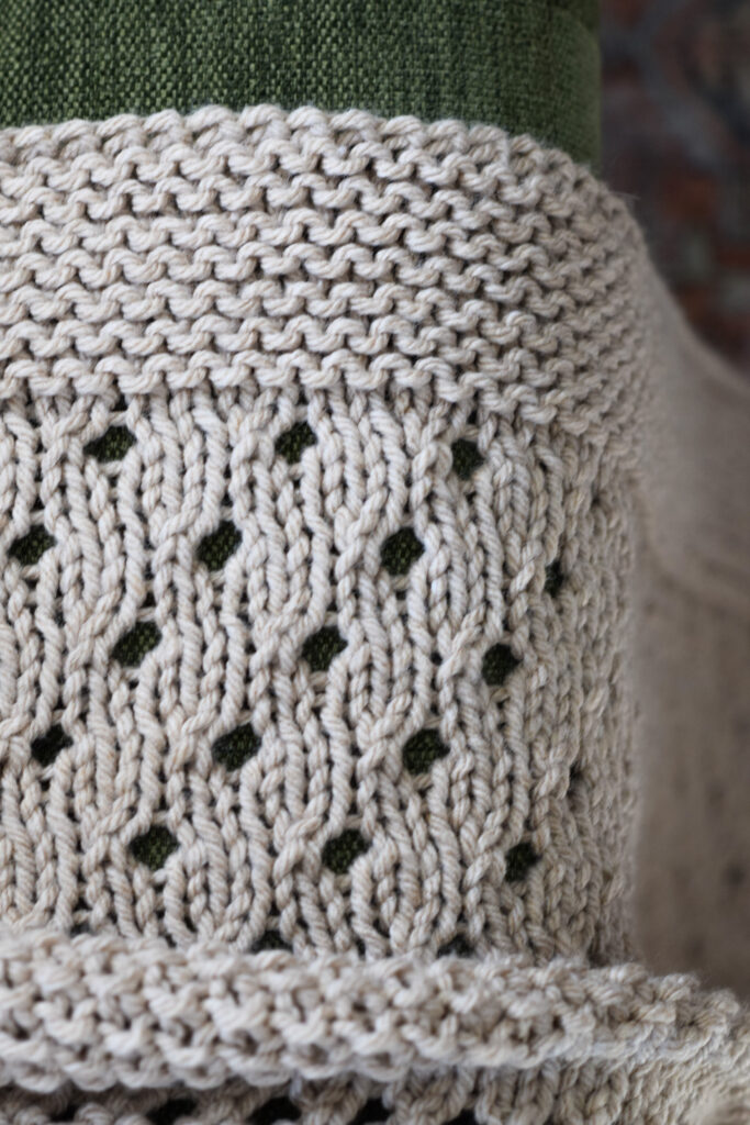 This throw is super cool because rather than just being striped, it’s actually a mirror image on each half. There is also a new stitch for us to try – the wandering eyelets or “staggered eyelets”.