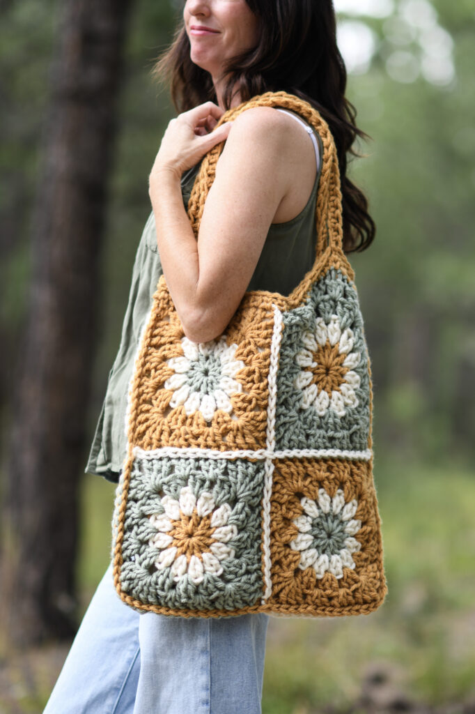 Granny squares have taken over, and I’ve also jumped on the bandwagon. So far there’s there’s been the Granny Square Hot Pad, the Granny Square Vest, The Arlo Cardigan, and more recently the Nora Granny Square Blanket! Sooooo, yeah, I’m into granny squares. And this bag, right? I’m loving it!!